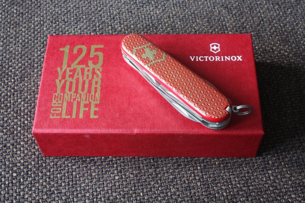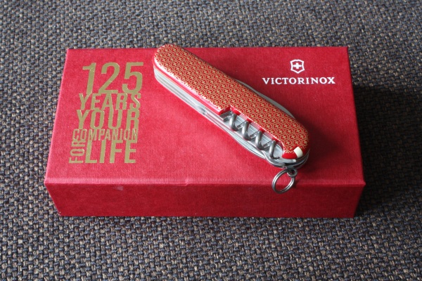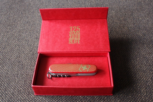 This Climber is part of the Jubilee Series which Victorinox released in 2009, celebrating their 125th anniversary. The knife has red cellidor scales with a nice pattern of the Swiss shield and cross printed in gold. It has a “125 YEARS YOUR COMPANION FOR LIFE” logo etched on the main blade. The series also included a Classic, a Cybertool and a SwissCard, a replica of the original 1891 Soldier’s knife, and more limited edition products.