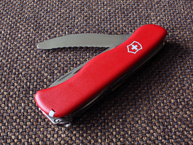 This is a red Jumpmaster. It’s a 111mm liner locking Swiss Army Knife with 4 layers. It’s one of only a few liner lock knives available with red nylon scales. It’s also one of a few knives containing a serrated emergency blade or seat belt cutter.