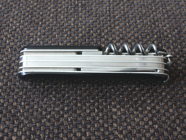 This one was made before 1991 since there is no hook on the back side of the scissors layer. Also, the corkscrew is fluted and there is a very thin key ring attachment point near the corkscrew. On newer knives (post 1991), the key ring attaches to the back spring on the reamer/awl side of the knife.