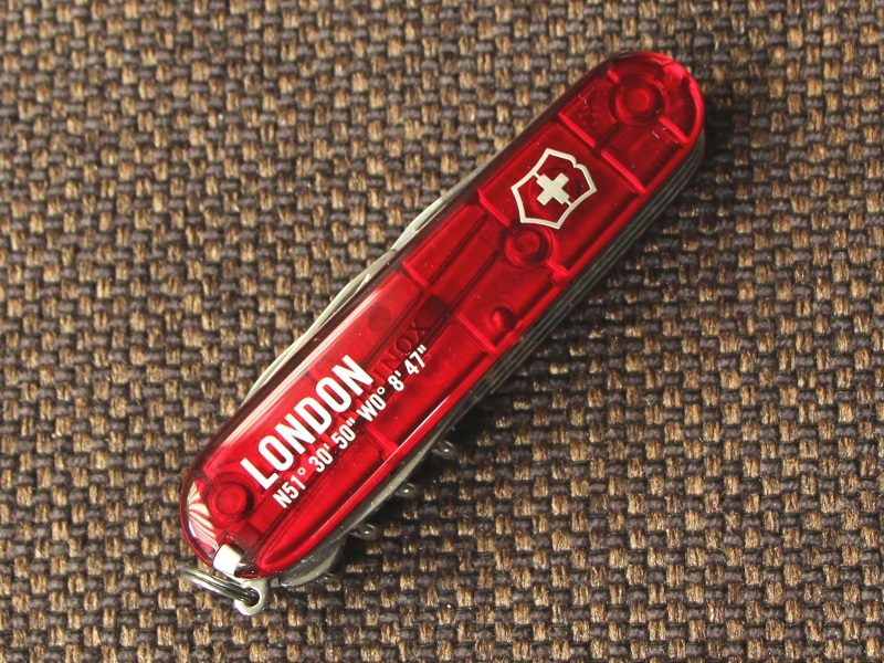 I recently bought this Climber on a trip to London. It is available in the Victorinox Flasghip Store New Bond Street. On the front of the ruby red scales you can see the coordinates where the flagship store is located. The back scale features a (faux) skyline of London, including the Shard, the London Eye and the Tower Bridge. The skyline is printed in white, as is the text on the front. Brunnen, Ibach, Düsseldorf, Rio de Janeiro and São Paolo versions exist as well, and probably more.