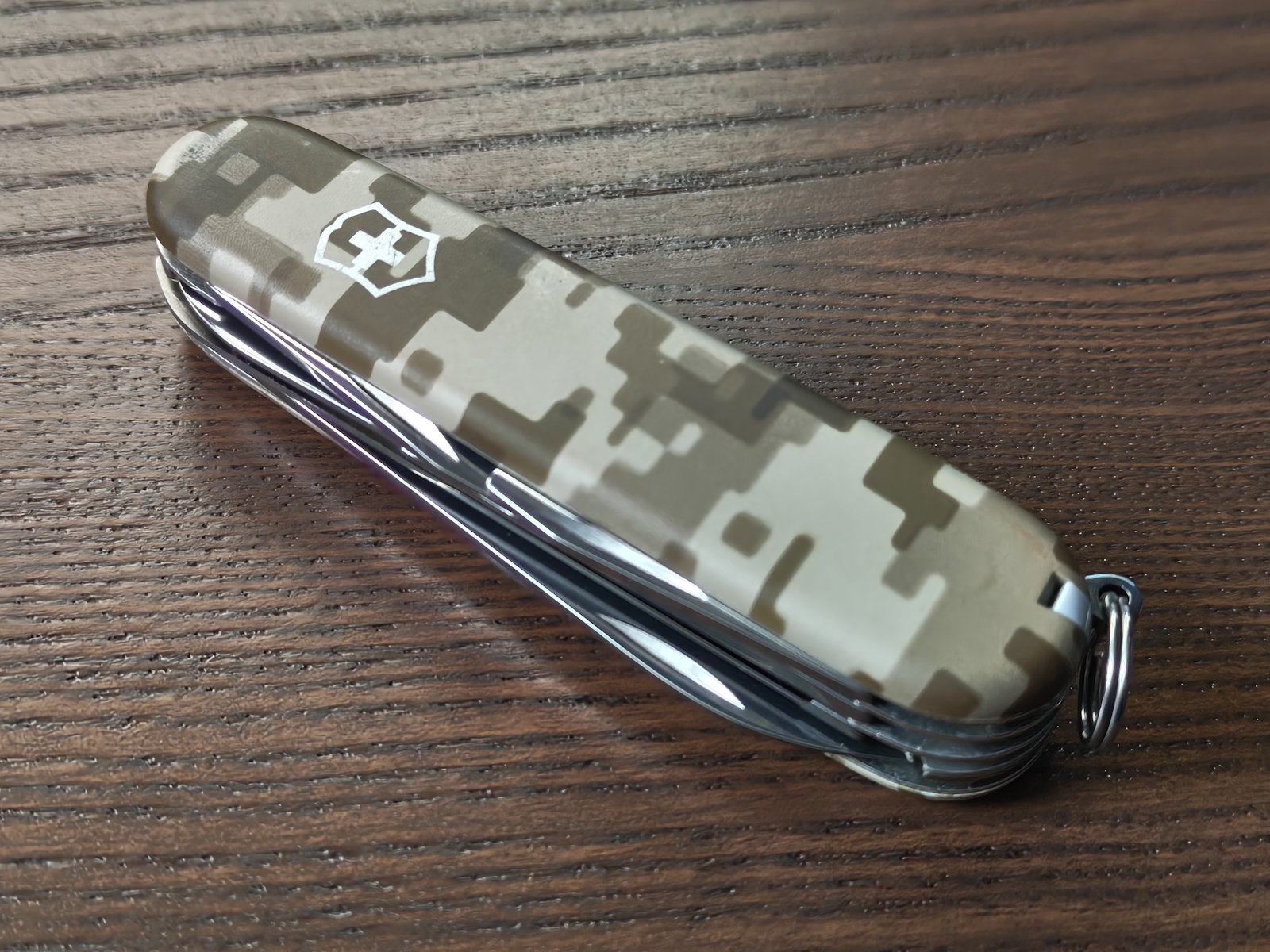 I really like the soft grip scales with the (Sandstorm?) digital camo pattern. They feel like paper. Not sure what the scale material is exactly. Since only a small, random part of the complete camo pattern is used, all of these SAKs are slightly different, just like these New Break-Up SAKs.