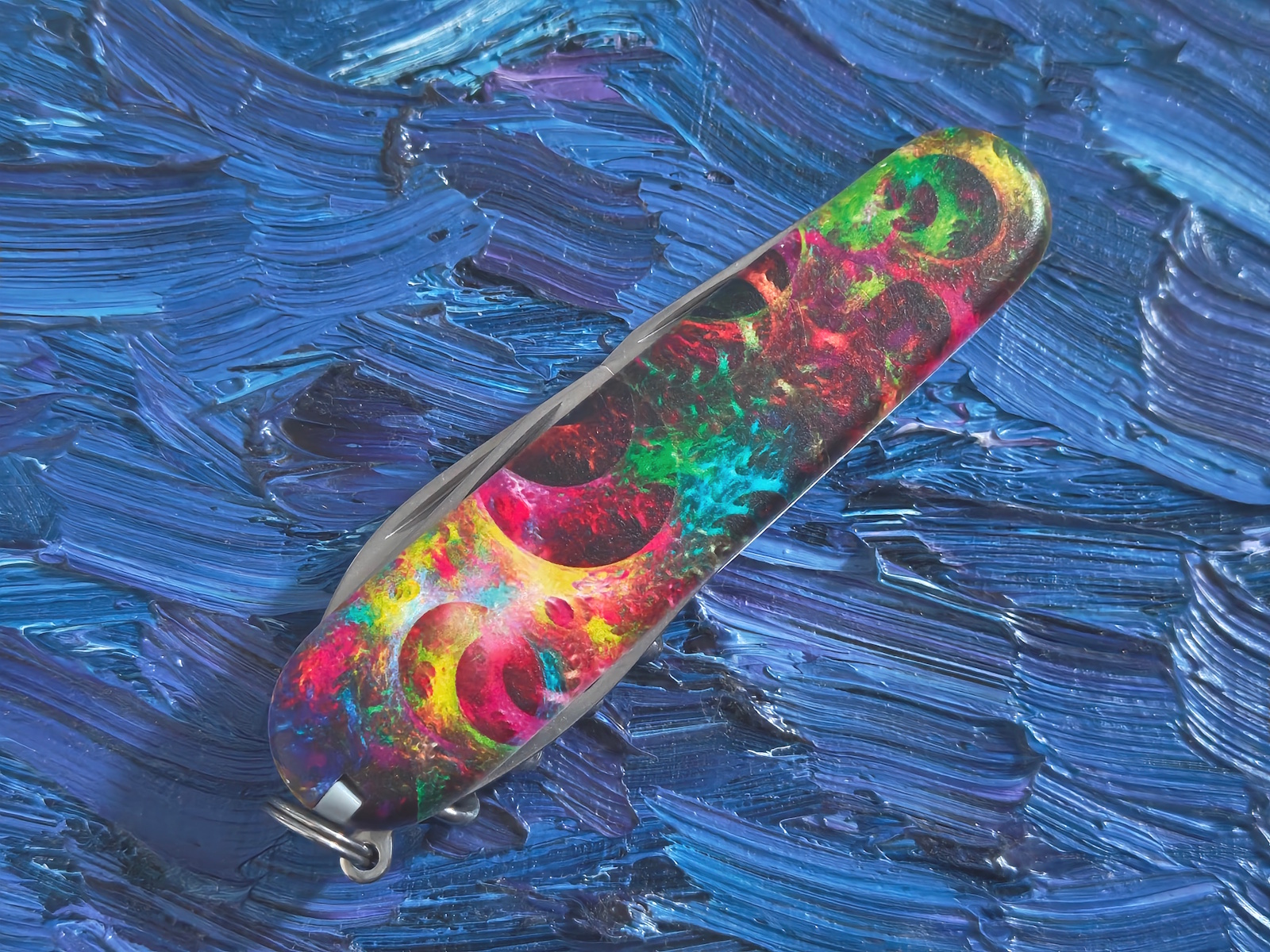 A nice Victorinox Spartan, custom made for Edelweiss.ch. It features a nice abstract design on the front scale. The back is just plain white cellidor.