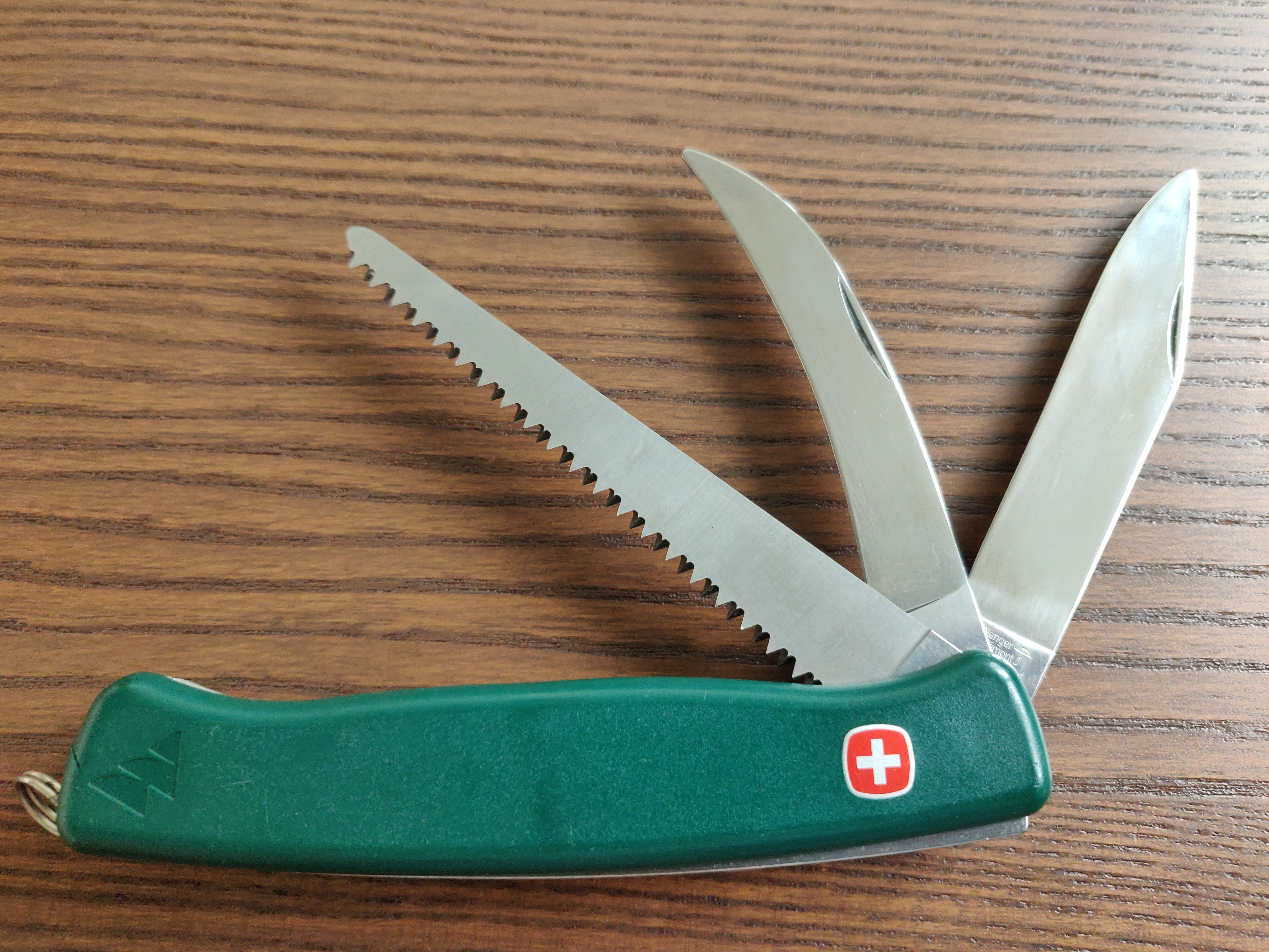 It’s quite an interesting Wenger SAK. It measures 120mm and it has green nylon scales. The tool config is unusual with a clip point main blade (liner locking), wood saw and a large gutting blade. There is no opener layer and this model has no back tools. More info can be found on SAKWiki.